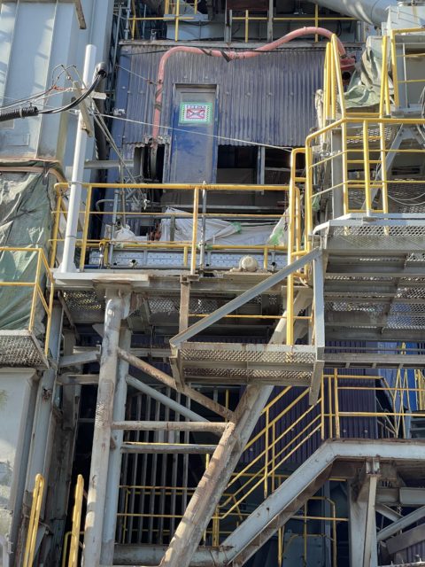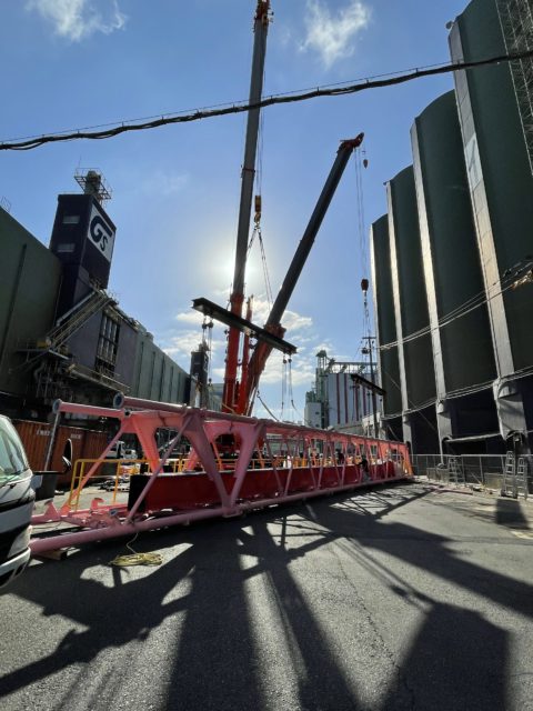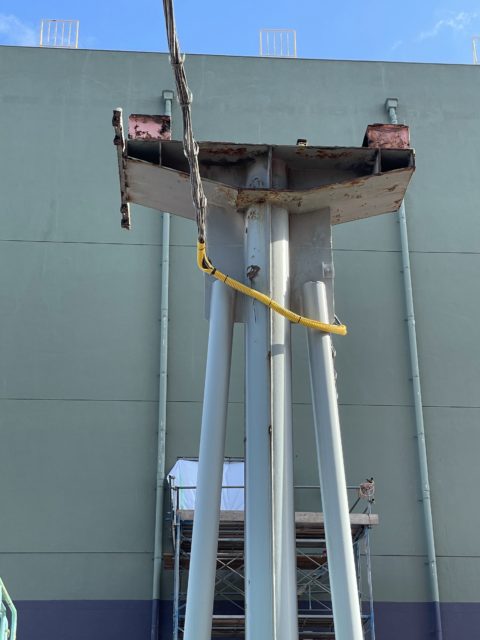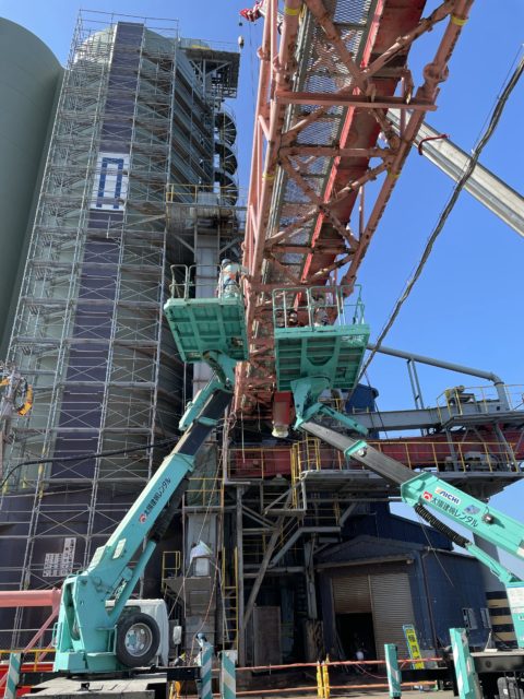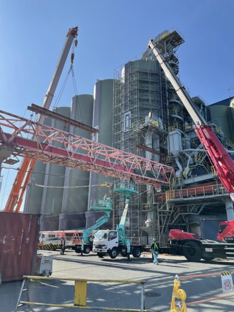 11月より福岡市某所にて大型コンベアの更新工事を着工致しました。まずは既存のコンベア撤去からだったのですが現場は海に近接しており潮風に晒され腐蝕もかなり進行し危険を伴う作業ではありましたが大熊職長以下10名安全を最優先事項とし作業に臨みました。